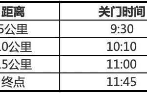 为了保证参赛者的比赛安全、顺利,比赛期间比赛路线各段设关门时间,限时对社会交通封闭。关门时间后,相应路段恢复社会交通。在规定的关门时间内,未跑完对应距离的参赛选手须立即停止比赛,退出赛道,以免发生危险。若有需要,退出比赛的选手可乘坐组委会提供的收容车或自行选乘公共交通抵达终点。关门时间按自然时间计算: